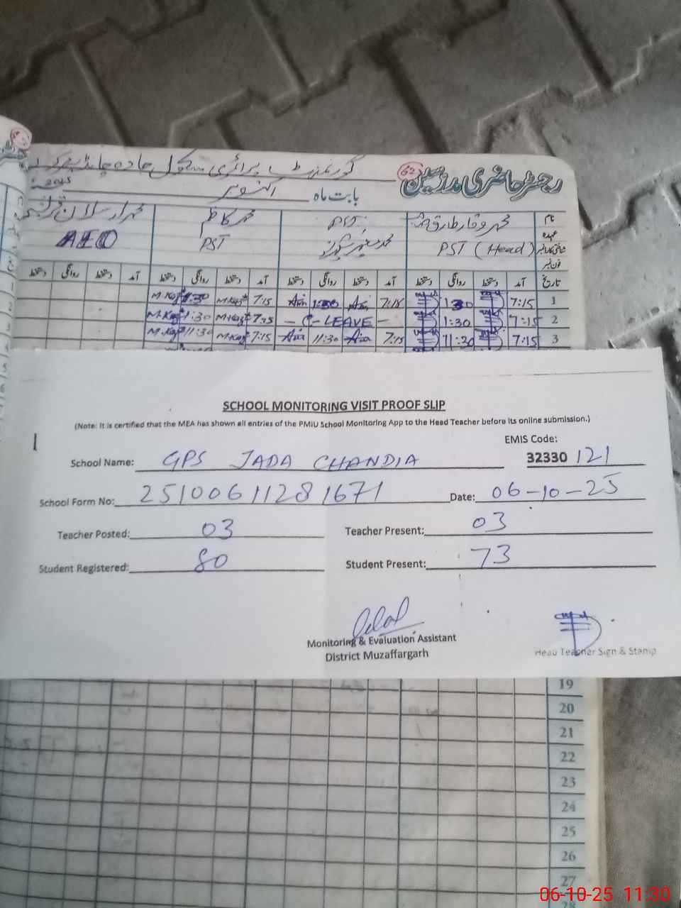 | Attendance Register | Head Teacher | MEA with School | Visit Proof |