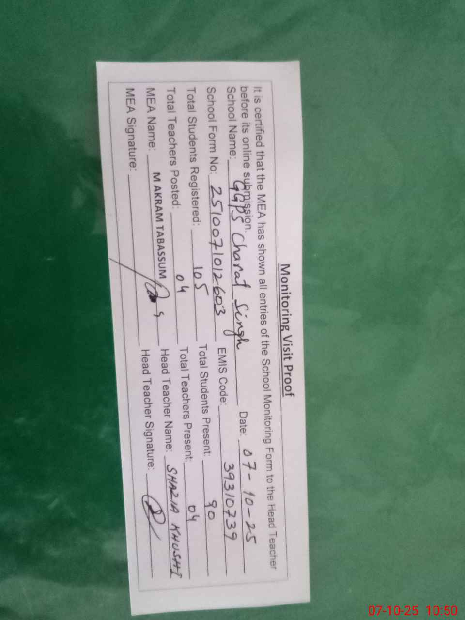 | Monitoring Date: 07-10-2025 | Start Time: 07-10-2025 10:12 AM | End Time: 07-10-2025 10:50 AM | Name of MEA: MU**** AK**** TA**** | |