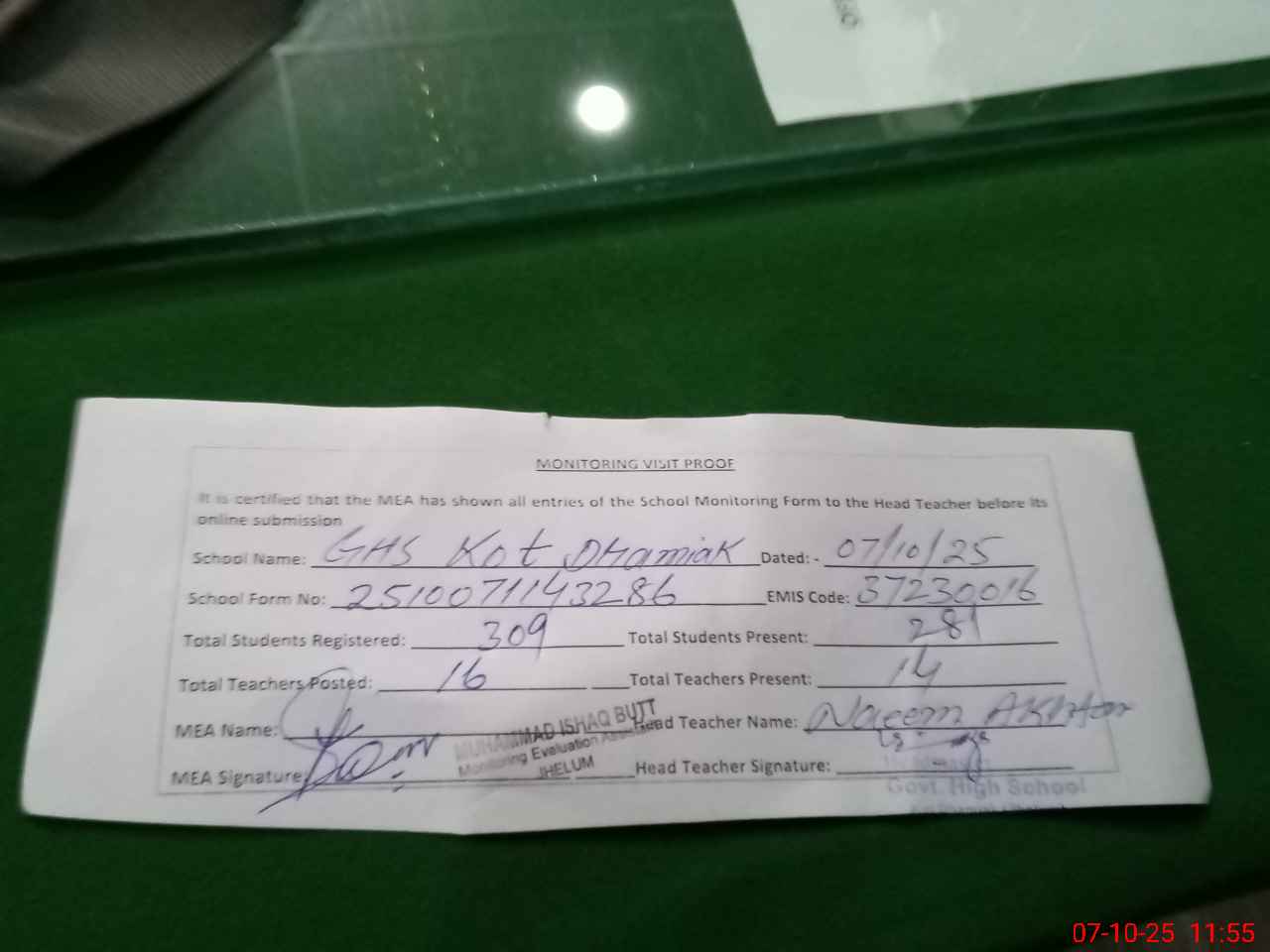 | EMIS Code: 37230016 | Name of School: GHS KOT DHAMIAK | |||