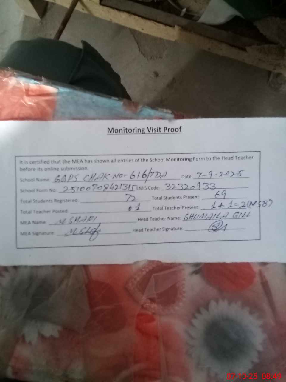 | Attendance Register | Head Teacher | MEA with School | Visit Proof |
