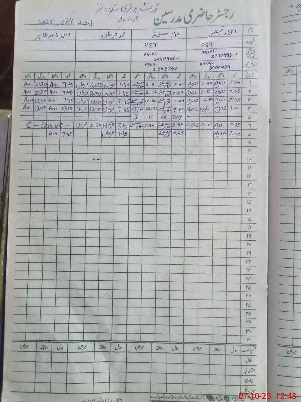 | CNIC | Full Name | Designation | R/C | Absence During Last Calender Month |