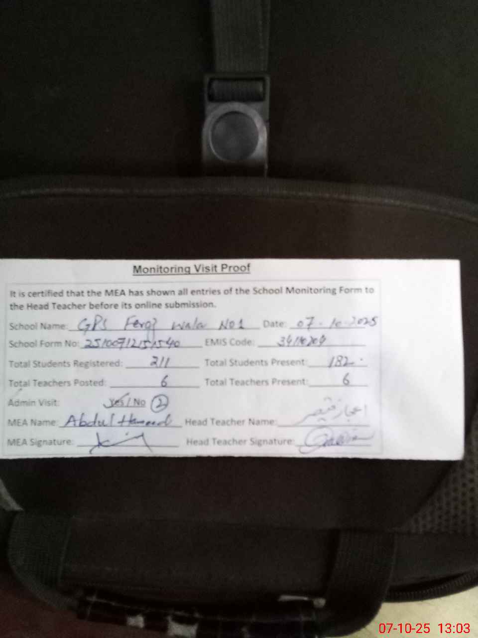 | Attendance Register | Head Teacher | MEA with School | Visit Proof |