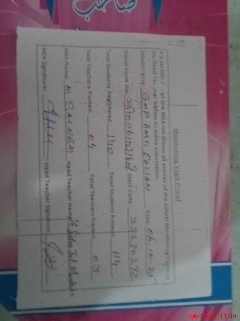 | EMIS Code: 33230292 | Name of School: GMPS BASTI QAZIAN | |||