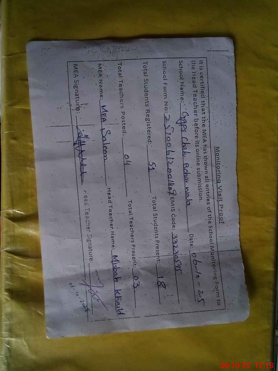 | EMIS Code: 33230595 | Name of School: GGPS CHAH BOHER WALA | |||