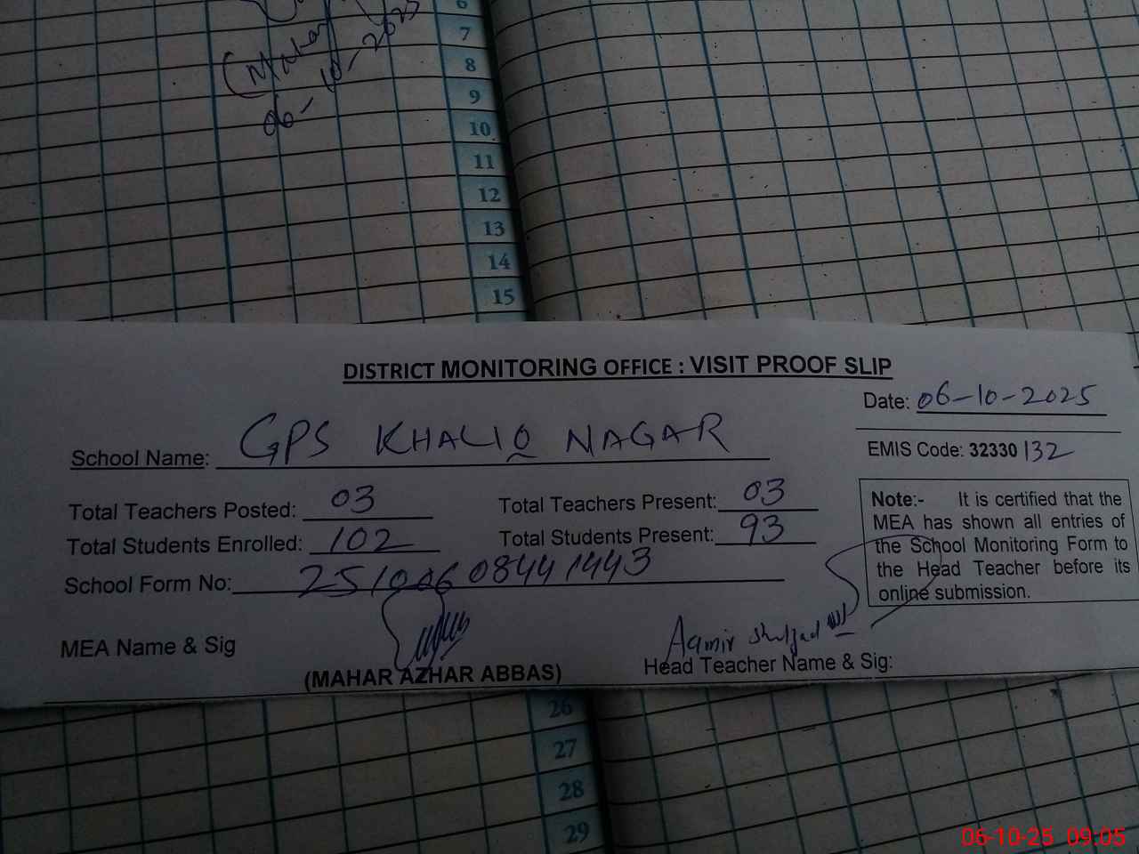 | Monitoring Date: 06-10-2025 | Start Time: 06-10-2025 08:44 AM | End Time: 06-10-2025 09:06 AM | Name of MEA: Ma**** Az**** Ab**** | |