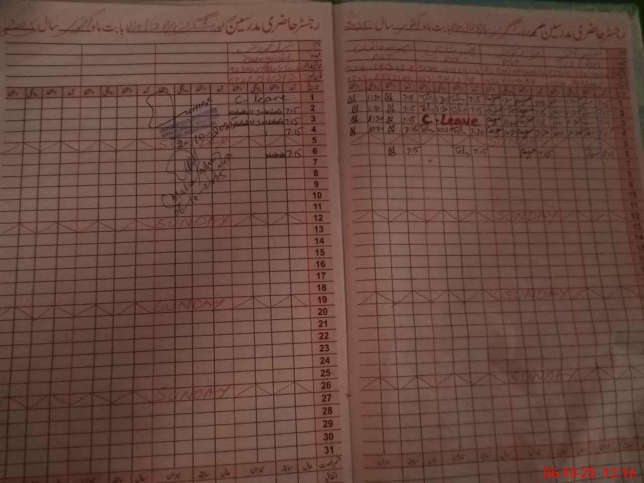 | CNIC | Full Name | Designation | R/C | Absence During Last Calender Month |