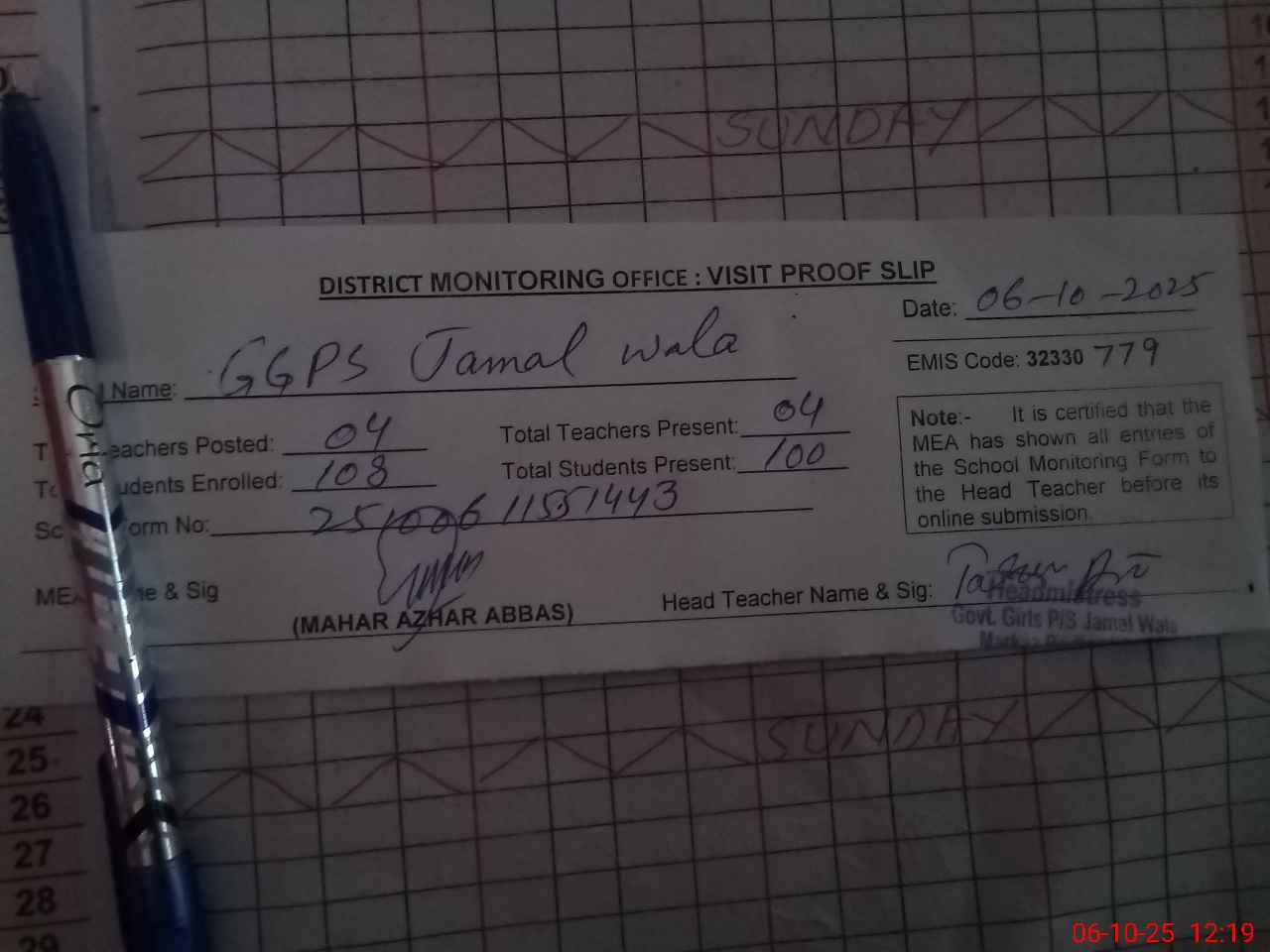| EMIS Code: 32330779 | Name of School: GGPS JAMAL WALA | |||