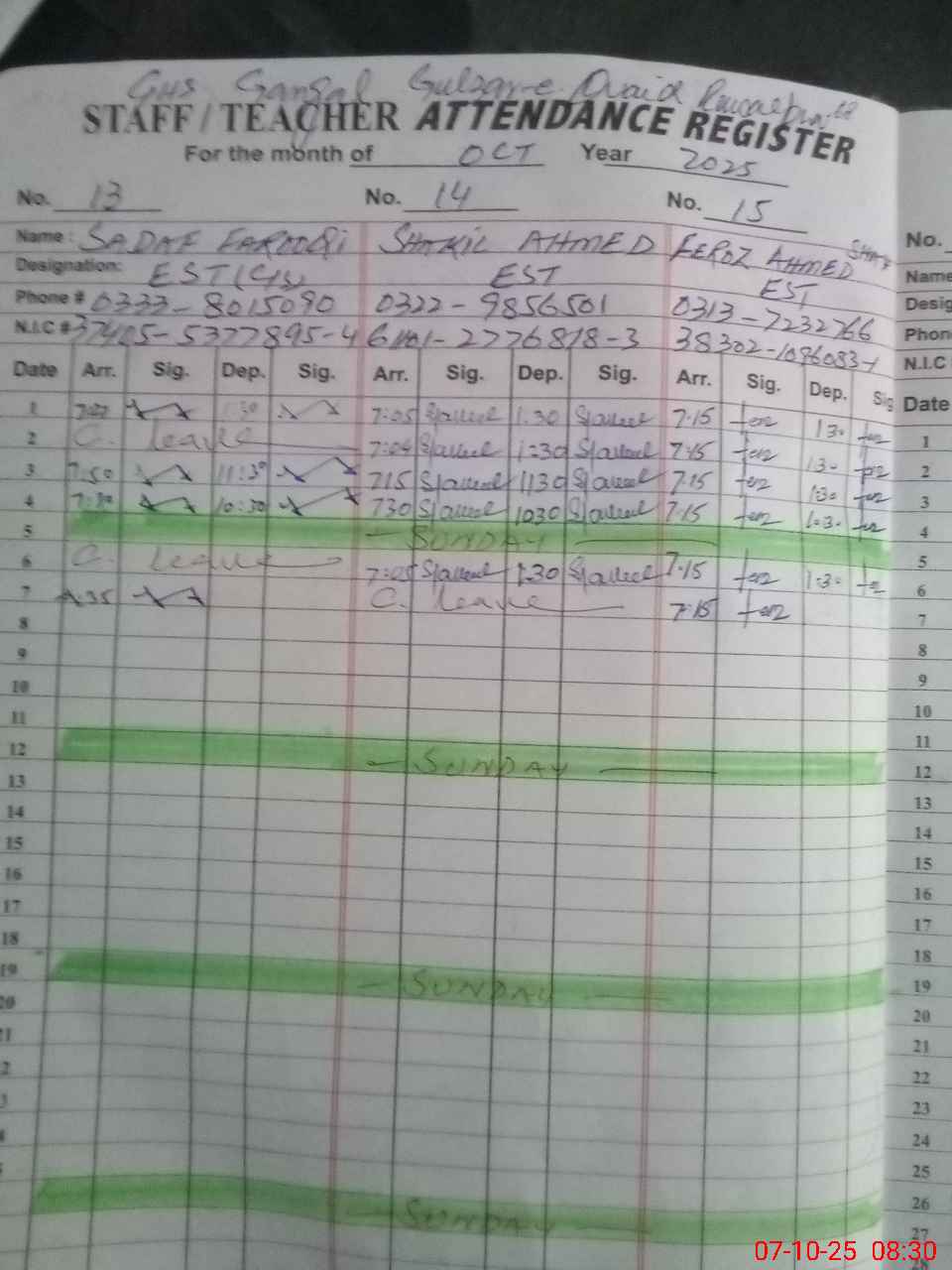 | CNIC | Full Name | Designation | R/C | Absence during last cal. month |