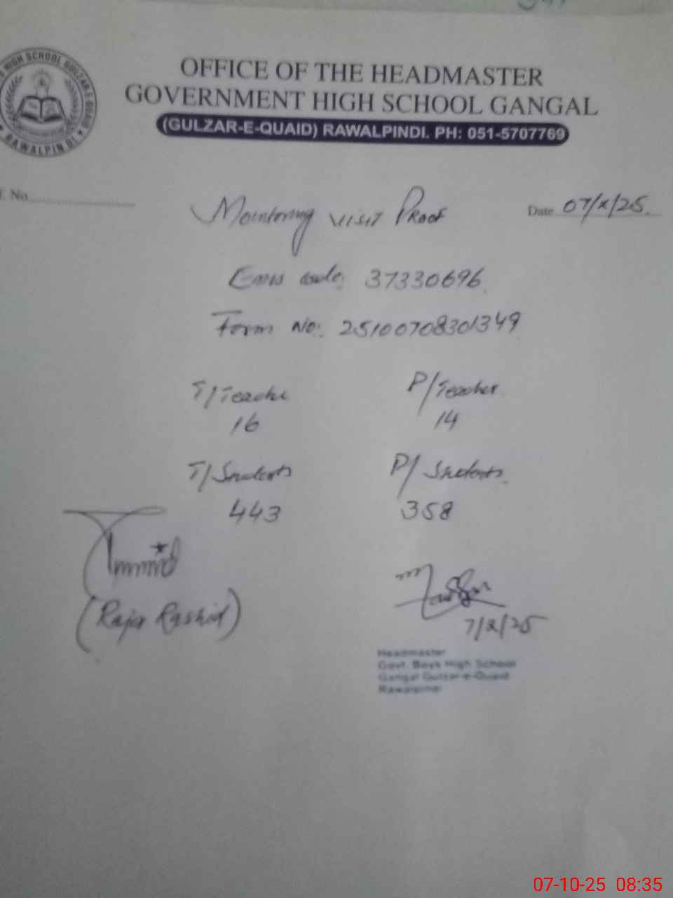 | Name: Qa**** Me**** Designation: (School Headmaster's/Headmistress's) HEADMASTER Phone/Cell Number: 03**** |