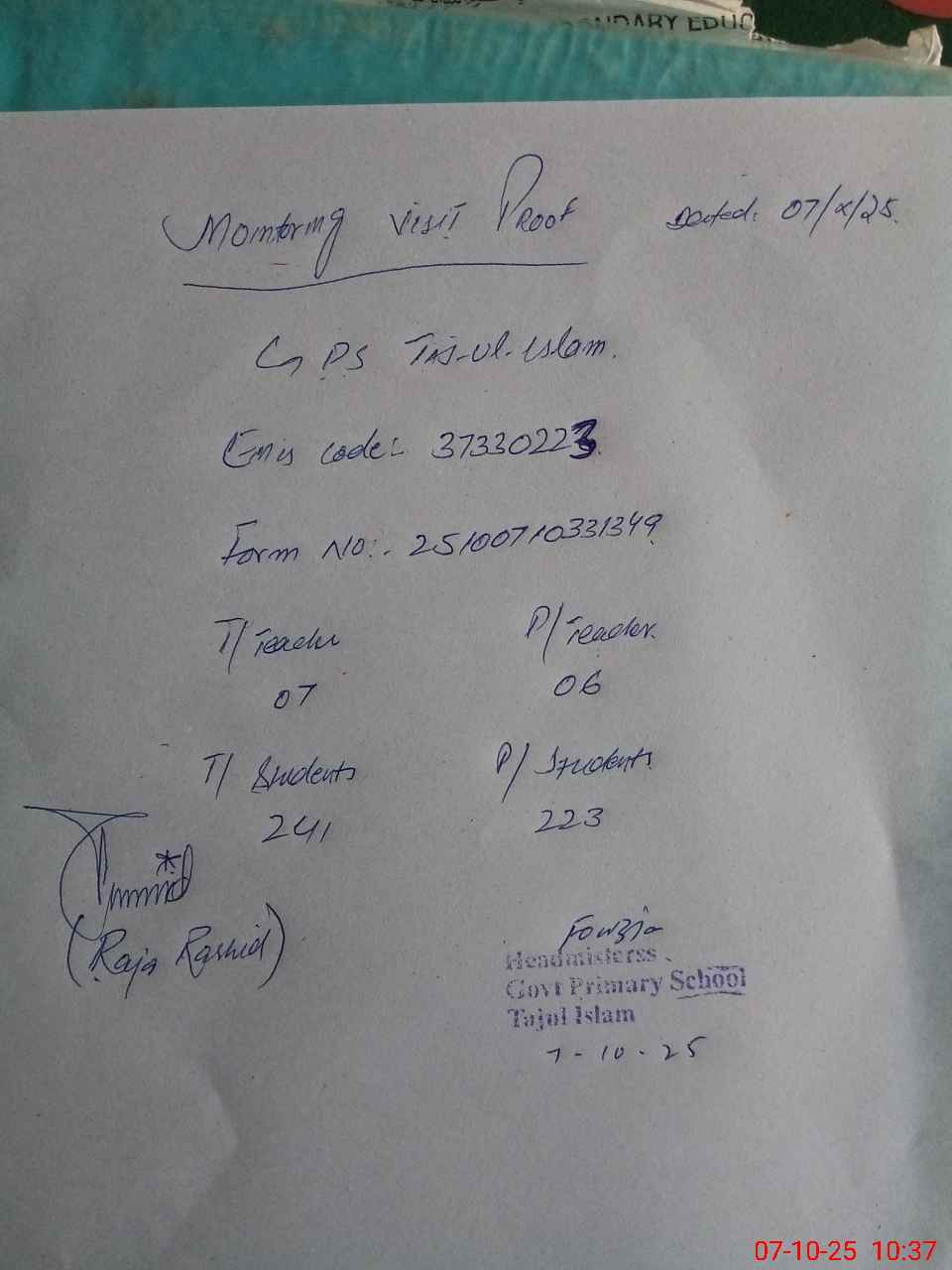 | EMIS Code: 37330223 | Name of School: GPS TAJ UL ISLAM | |||