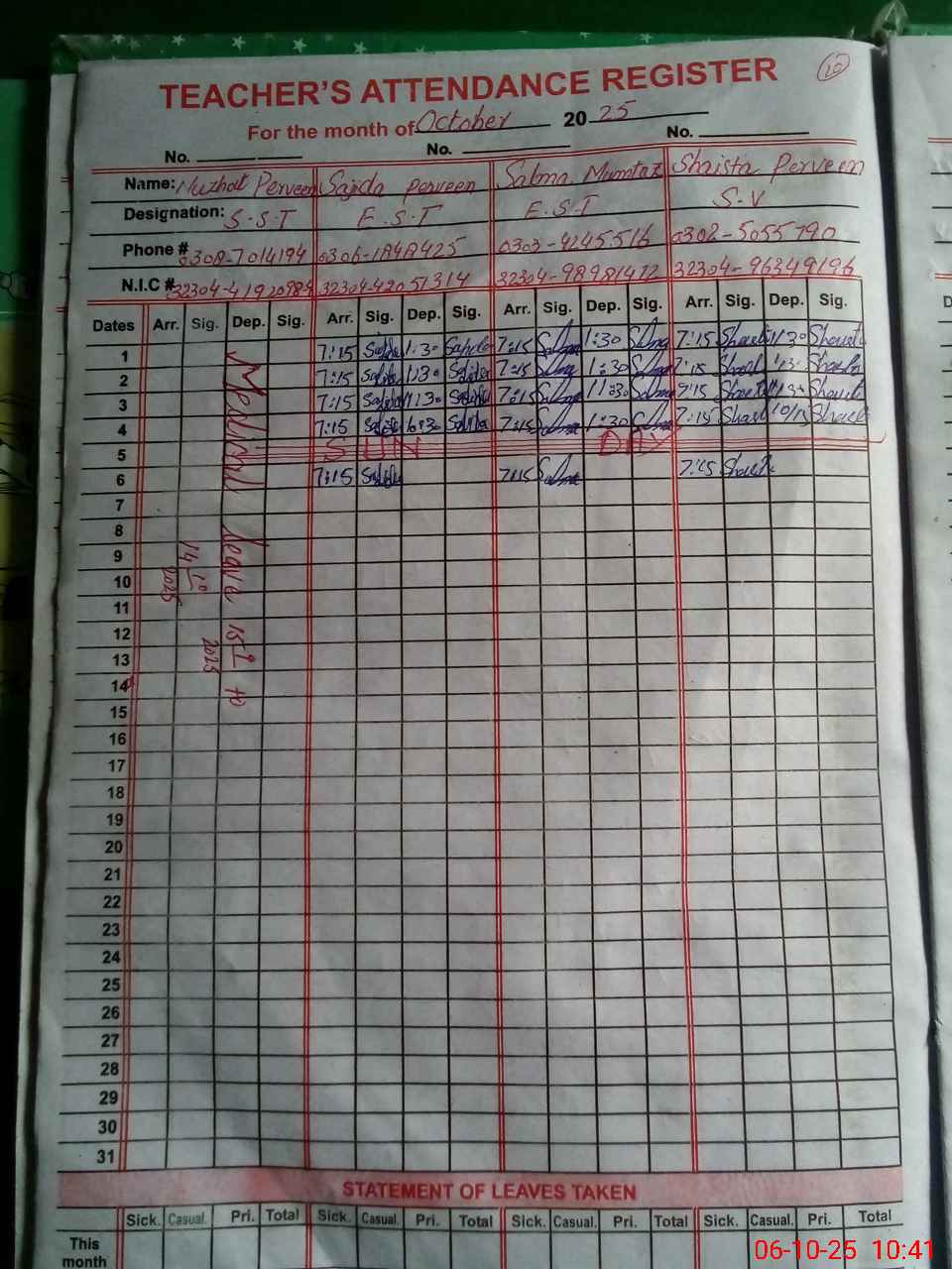 | CNIC | Full Name | Designation | R/C | Absence During Last Calender Month |