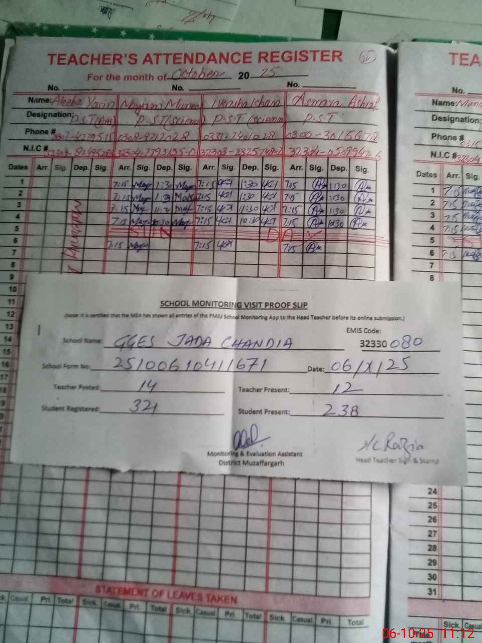 | Attendance Register | Head Teacher | MEA with School | Visit Proof |