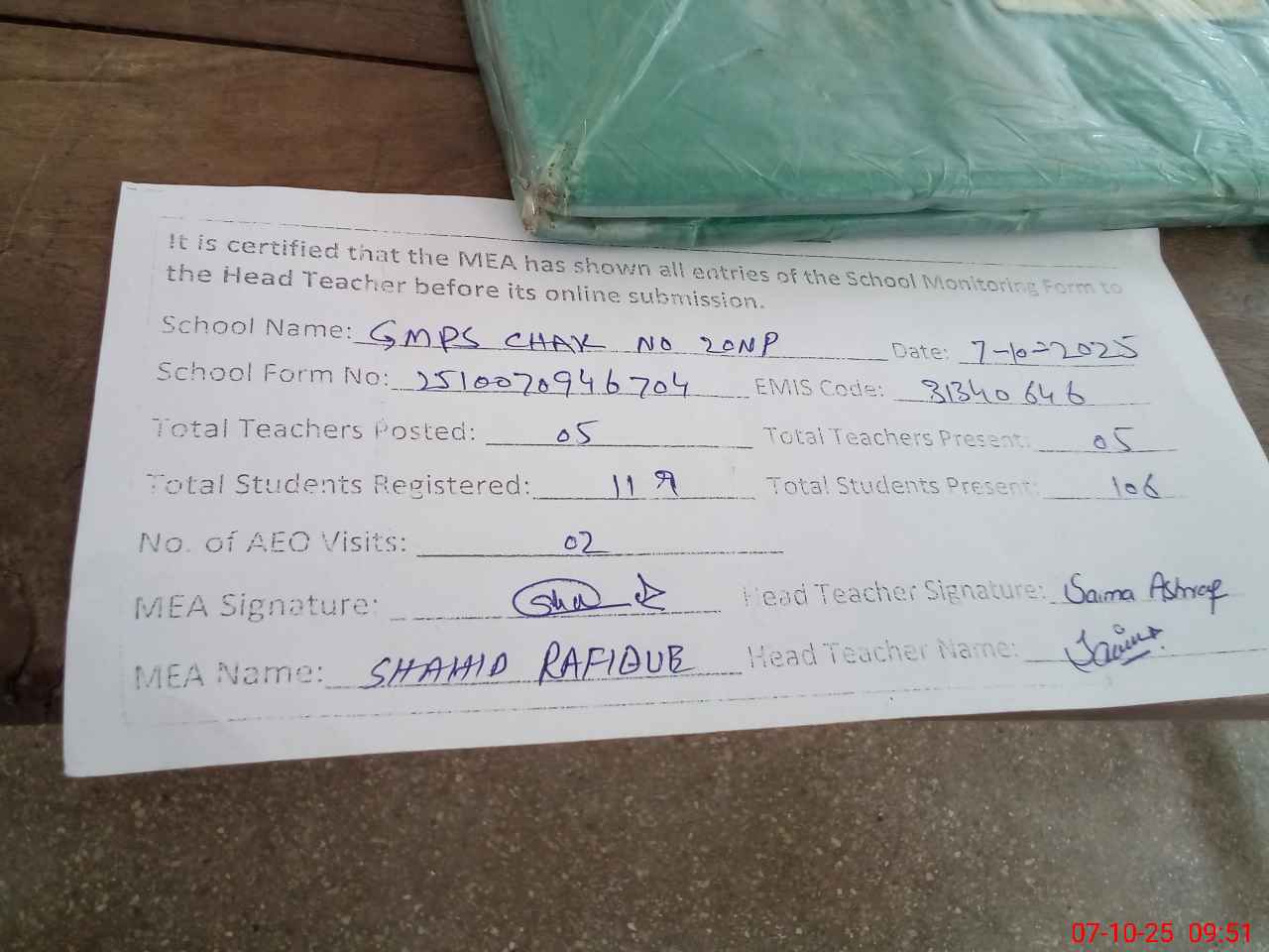 | EMIS Code: 31340646 | Name of School: GMPS CHAK NO.20/NP | |||