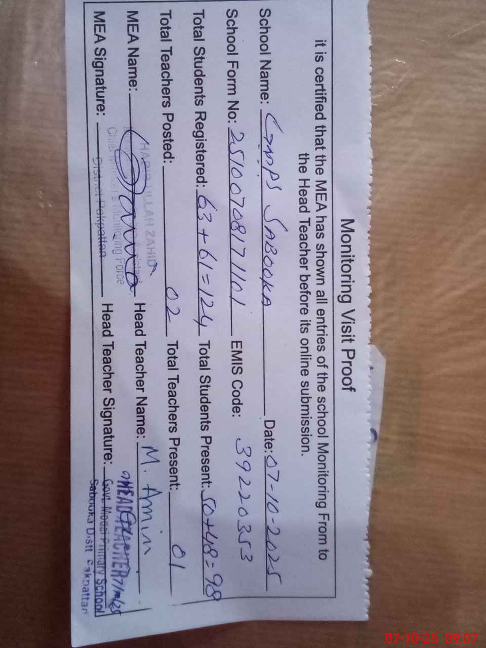 | EMIS Code: 39220353 | Name of School: GMPS SABOOKA DAKHANA TIBI LAL BAIG | |||
