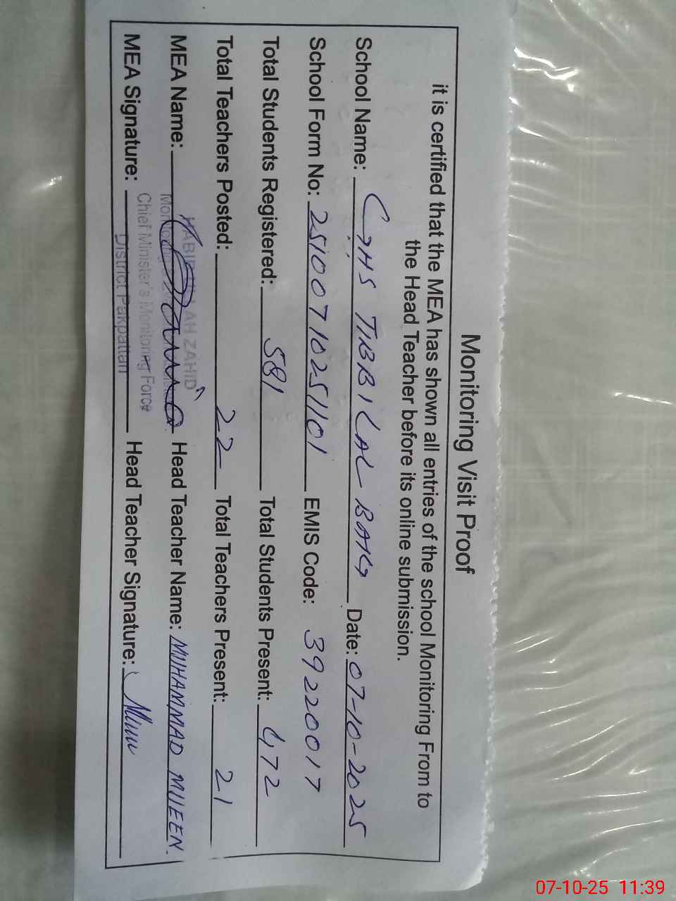 | Certified that this School was Inspected by the Undersigned MEA/DMO Today and the Information Stated Above is as Per Record. | |||||
