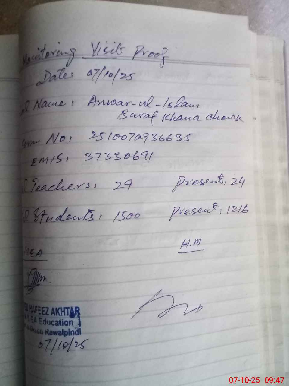 | Remarks (Use Separate Page if Required): Head Teacher Mariam Murtaza has been transferred out since 26th September 20025 while her name is still being shown in pmiu and sis both apps NSB record not updated in pmiu and sis both apps Students of class 7 listed in pmiu app are not updated All students have left school after promotion from class 10 | |||||