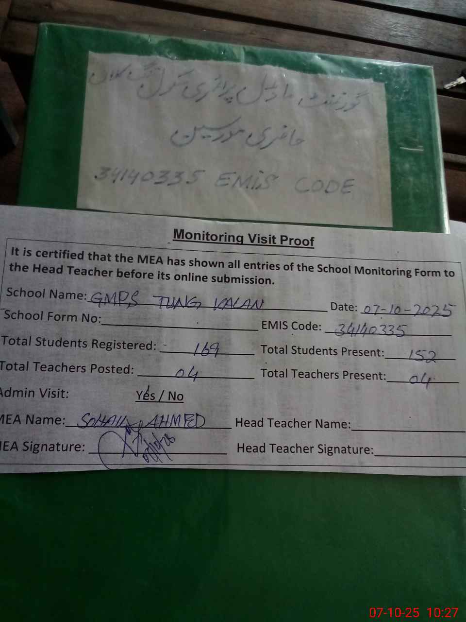 | Attendance Register | Head Teacher | MEA with School | Visit Proof |