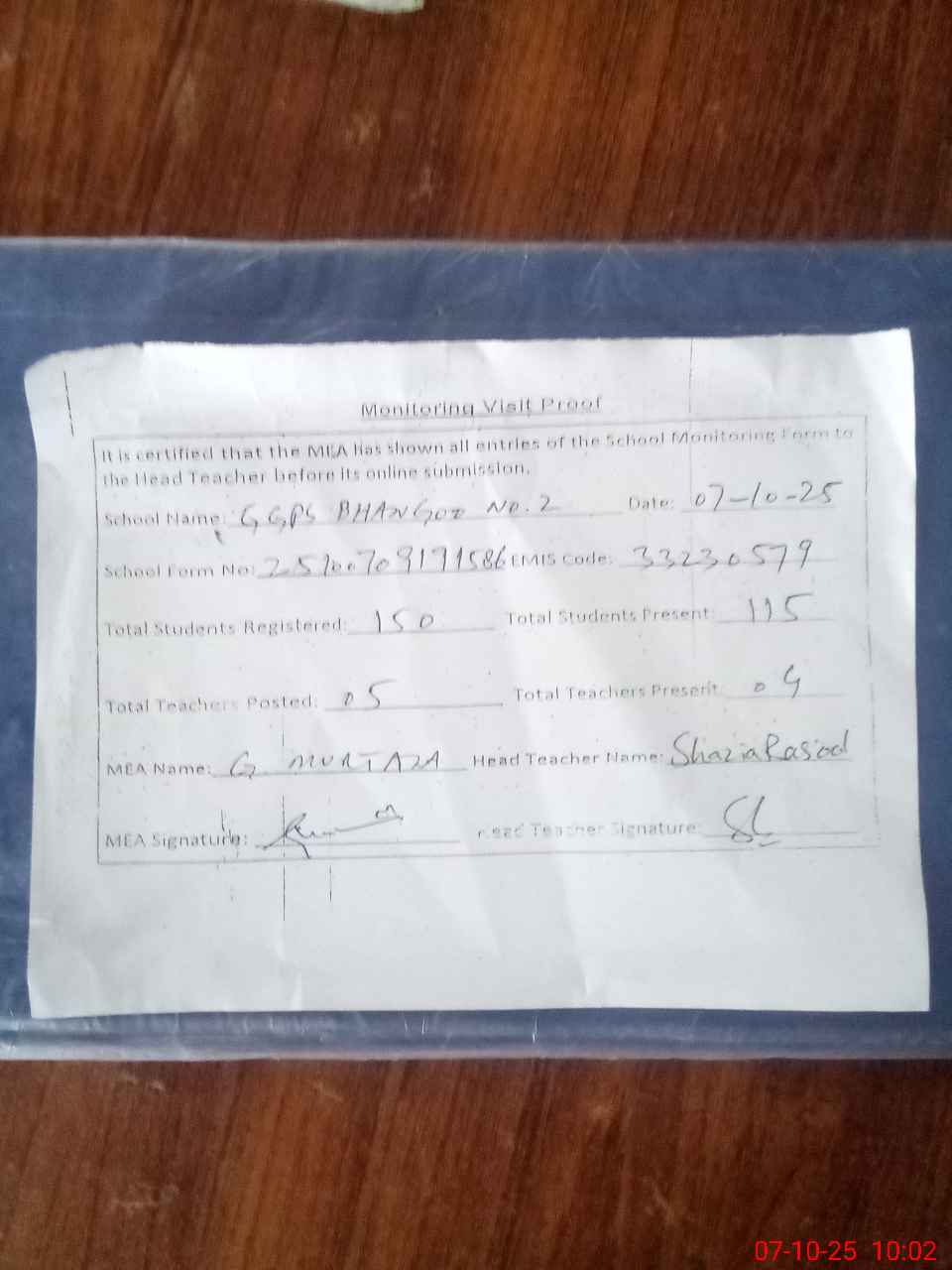 | EMIS Code: 33230579 | Name of School: GGPS BHANGOO NO 2 | |||
