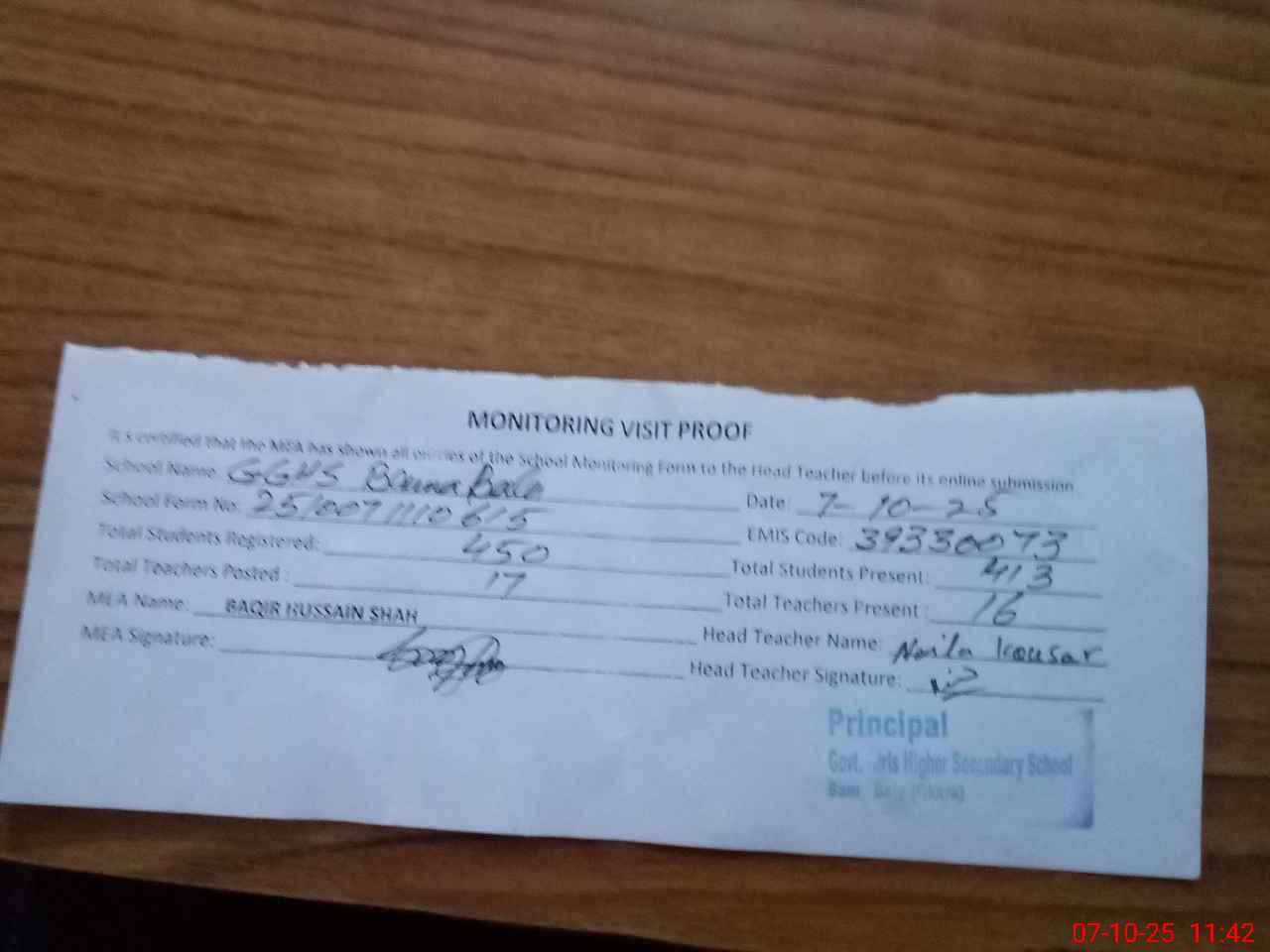 | Attendance Register | Head Teacher | MEA with School | Visit Proof |
