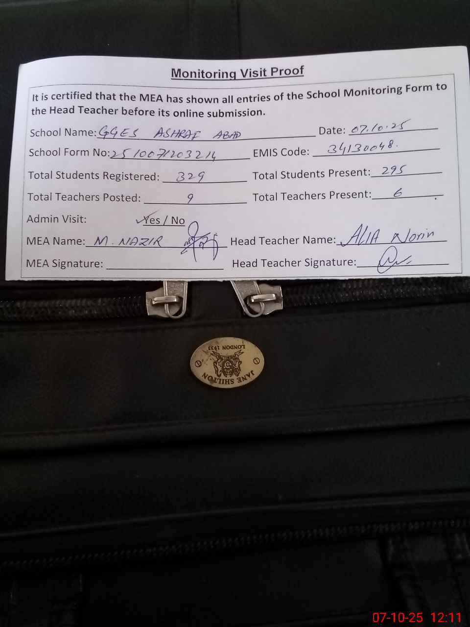| Attendance Register | Head Teacher | MEA with School | Visit Proof |