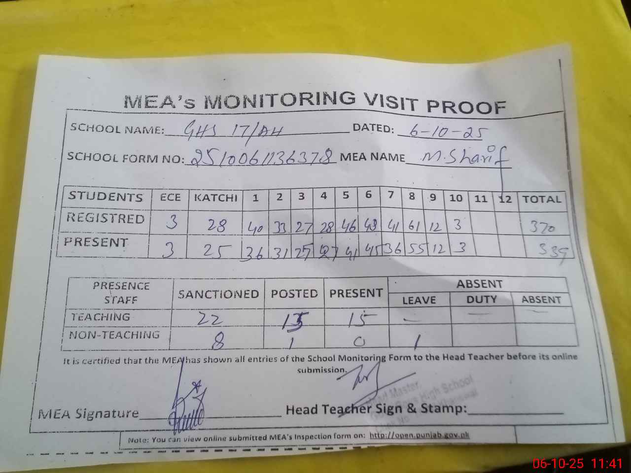 | EMIS Code: 36420067 | Name of School: GHS 17/AH, KHANEWAL | |||