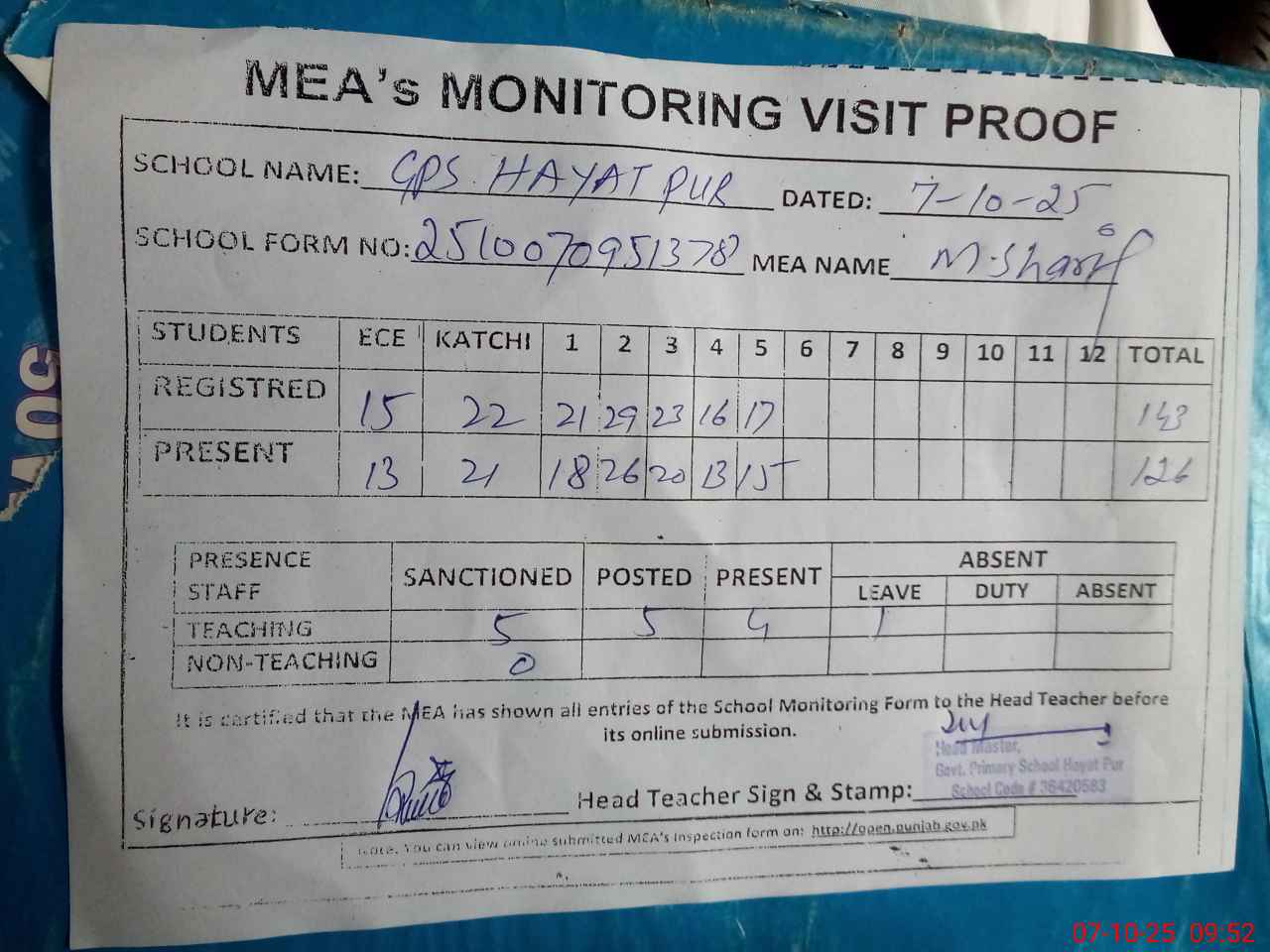 | EMIS Code: 36420583 | Name of School: GPS HAYAT PUR, KHANEWAL | |||