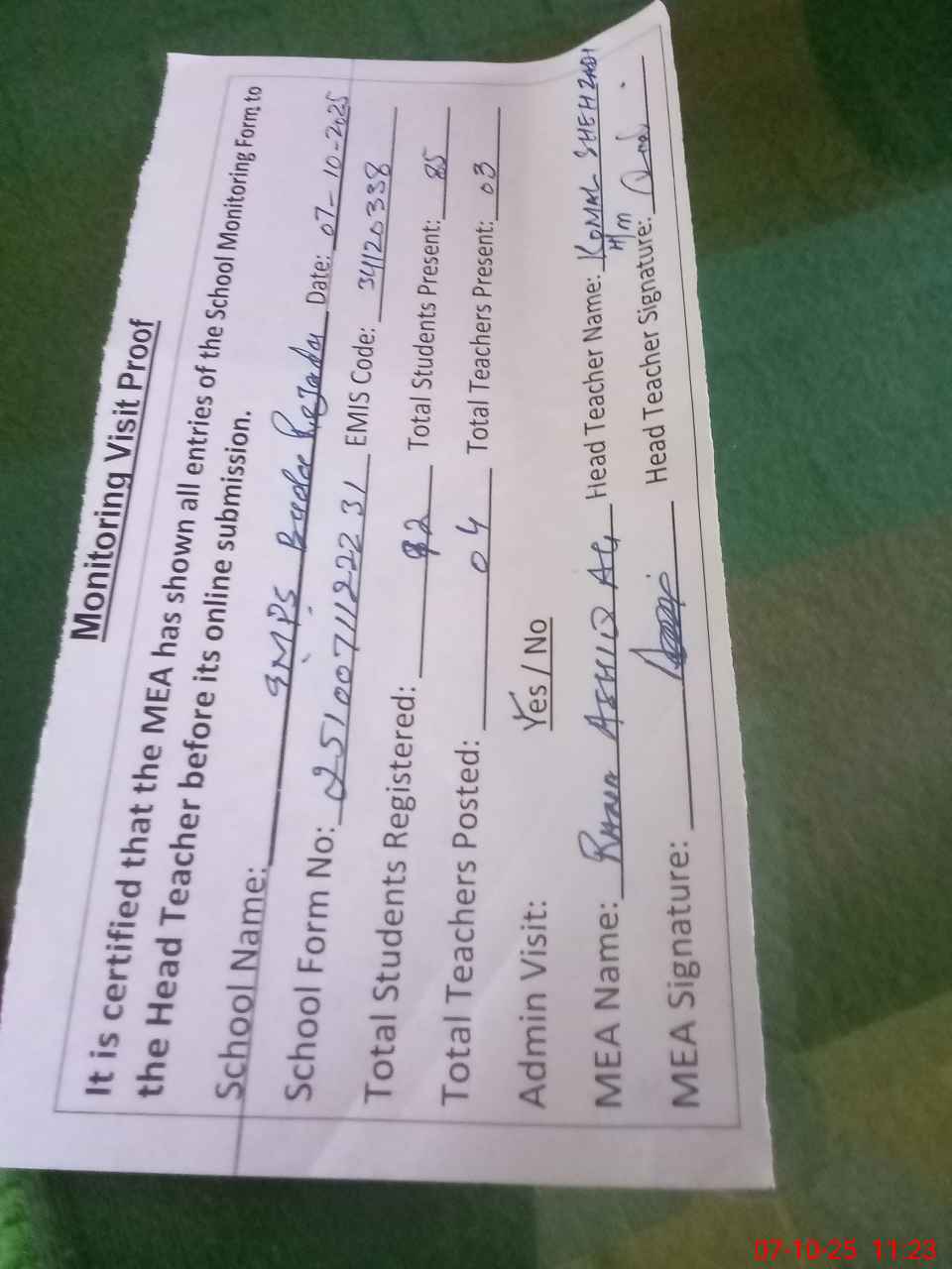 | Attendance Register | Head Teacher | MEA with School | Visit Proof |