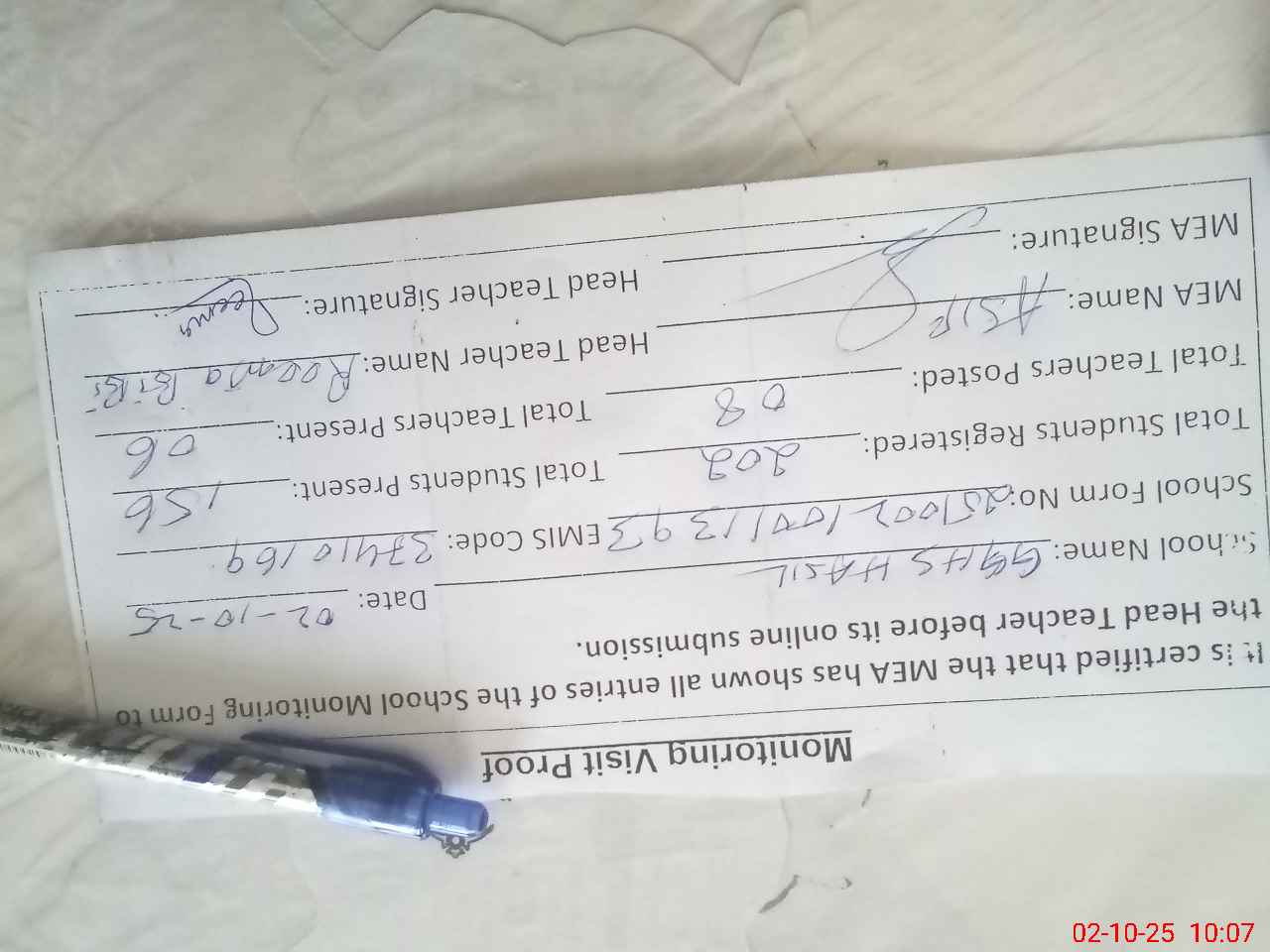 | Certified that this School was Inspected by the Undersigned MEA/DMO Today and the Information Stated Above is as Per Record. | |||||