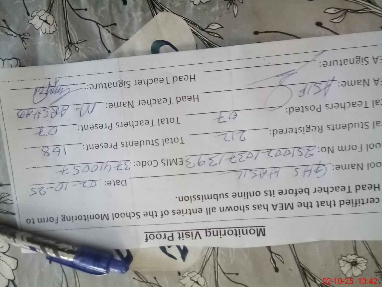 | Certified that this School was Inspected by the Undersigned MEA/DMO Today and the Information Stated Above is as Per Record. | |||||