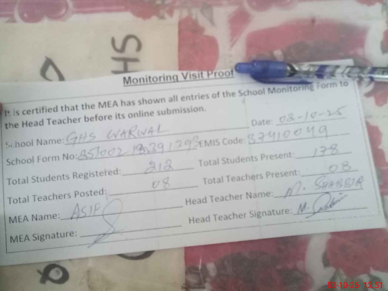| EMIS Code: 37410049 | Name of School: GHS WARWAL | |||