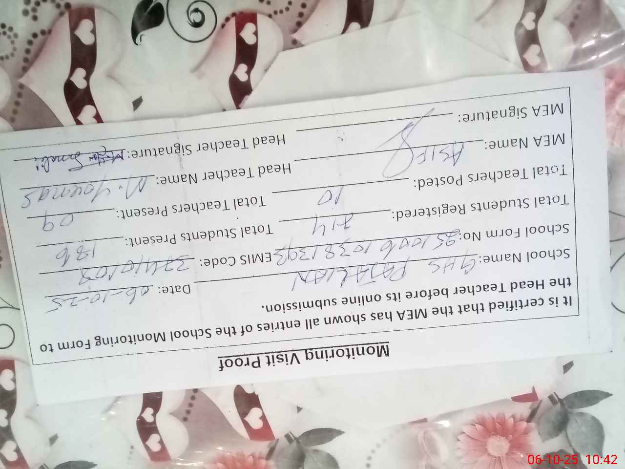 | Certified that this School was Inspected by the Undersigned MEA/DMO Today and the Information Stated Above is as Per Record. | |||||