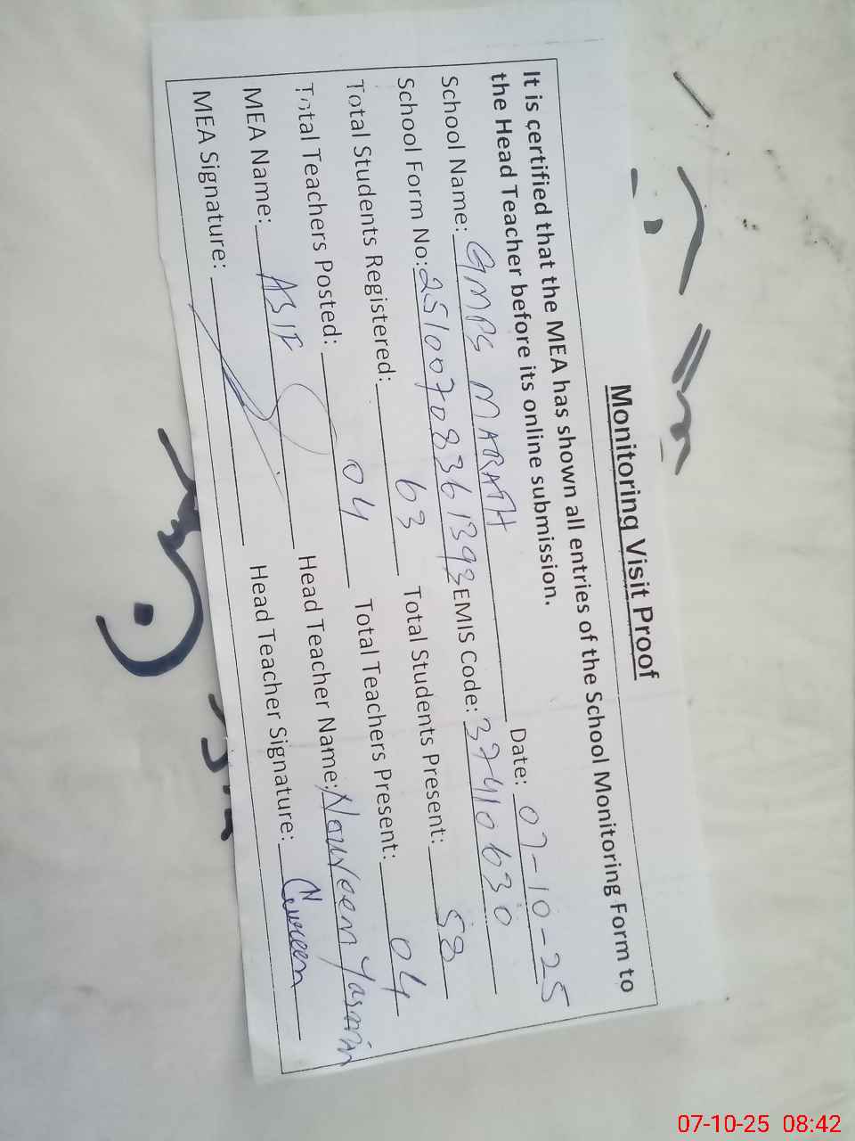 | Attendance Register | Head Teacher | MEA with School | Visit Proof |