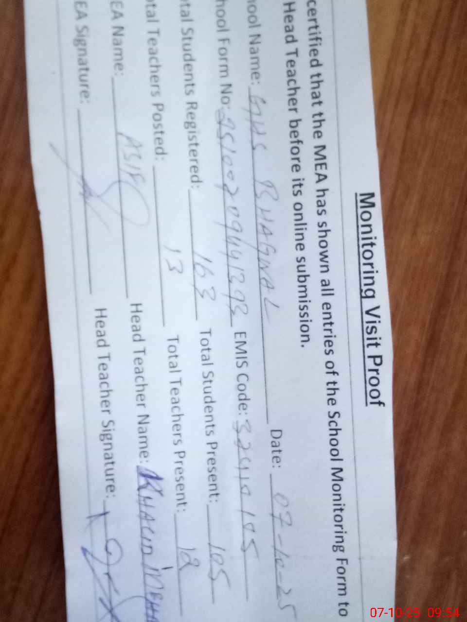 | Attendance Register | Head Teacher | MEA with School | Visit Proof |