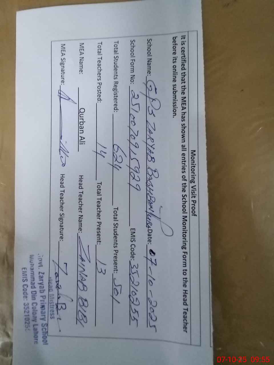 | EMIS Code: 35210255 | Name of School: GPS ZARYAB BAGHBANPURA LAHORE | |||