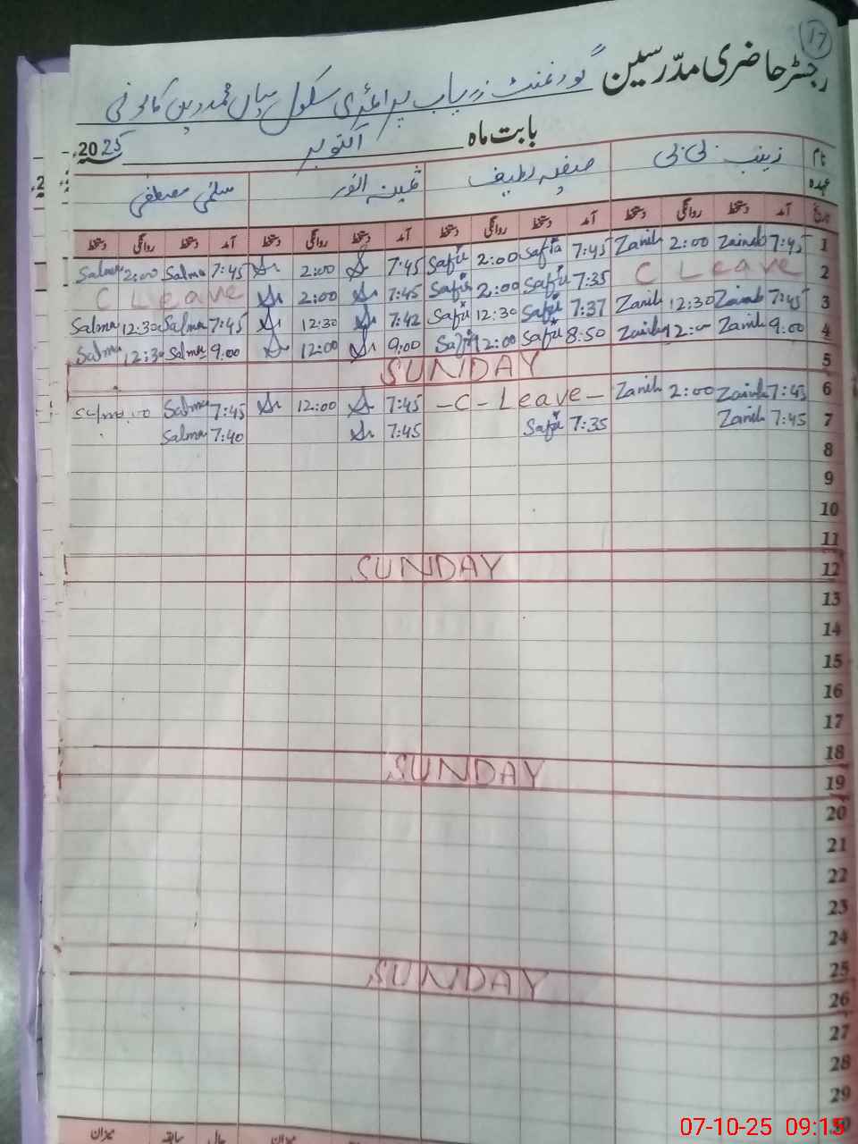 | CNIC | Full Name | Designation | R/C | Absence during last cal. month | Leave Type | Remarks for today (Leave,Training, Exam,Absent,Late, Other duty) | |||||||