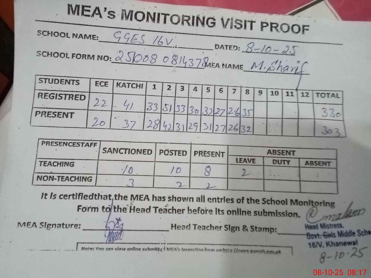 | Attendance Register | Head Teacher | MEA with School | Visit Proof |