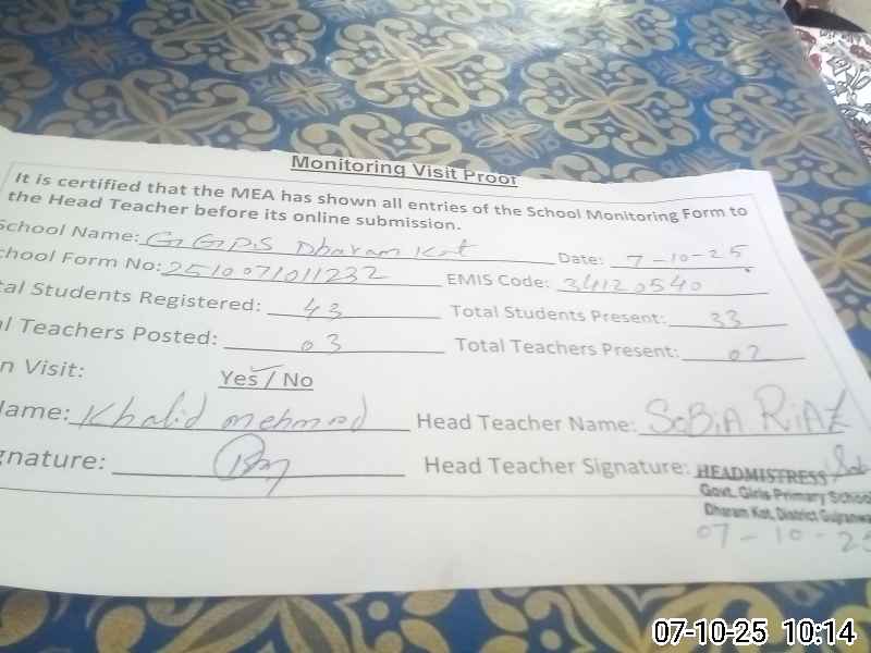 | EMIS Code: 34120540 | Name of School: GGPS DHARAM KOT | |||