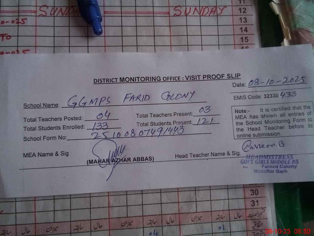 | Attendance Register | Head Teacher | MEA with School | Visit Proof |