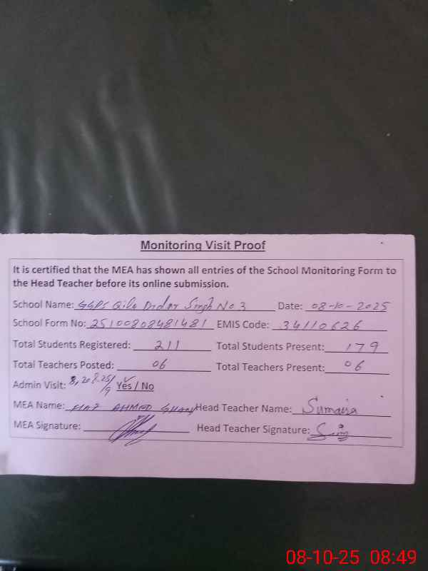 | EMIS Code: 34110626 | Name of School: GGPS QILA DIDAR SINGH NO.3 (BOTHAN PURA) | |||