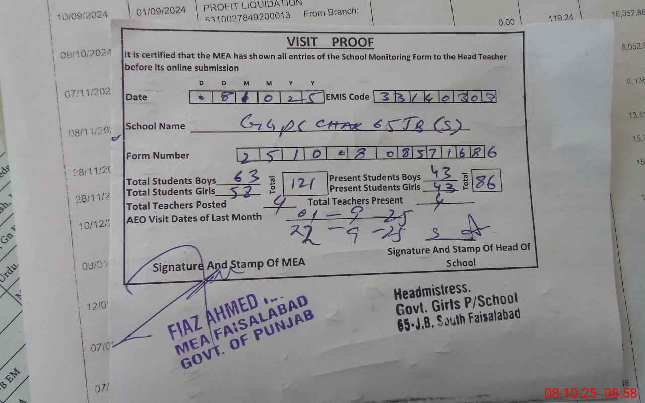 | Attendance Register | Head Teacher | MEA with School | Visit Proof |