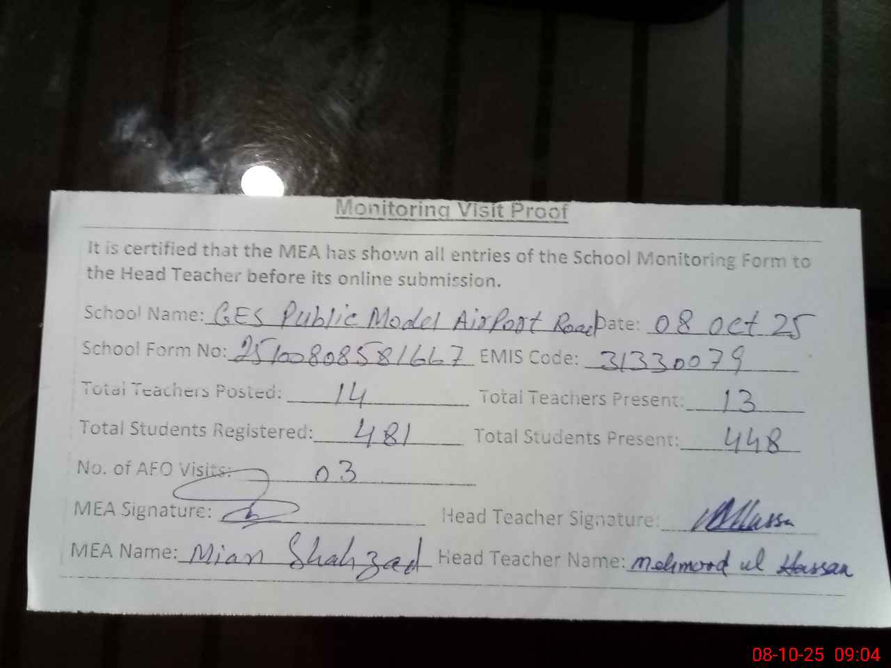 | Monitoring Date: 08-10-2025 | Start Time: 08-10-2025 08:36 AM | End Time: 08-10-2025 09:04 AM | Name of MEA: Sh**** Ah**** | |