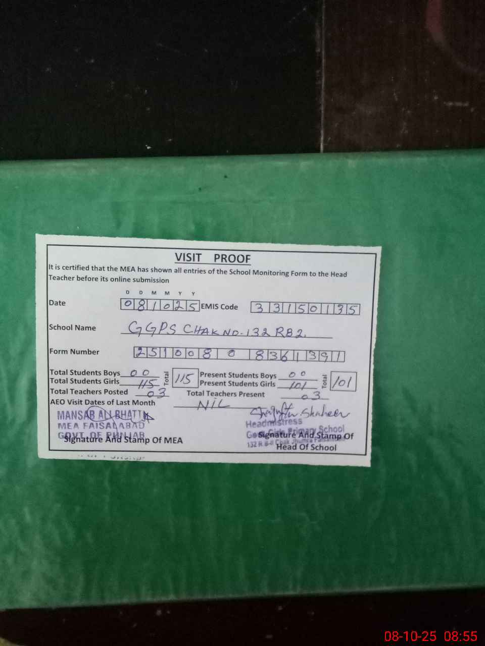 | EMIS Code: 33150135 | Name of School: GGPS CHAK NO 132 RB 2 | |||