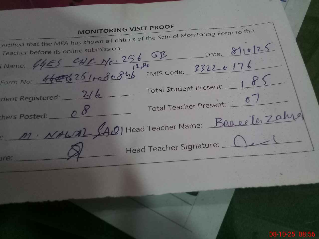 | Attendance Register | Head Teacher | MEA with School | Visit Proof |