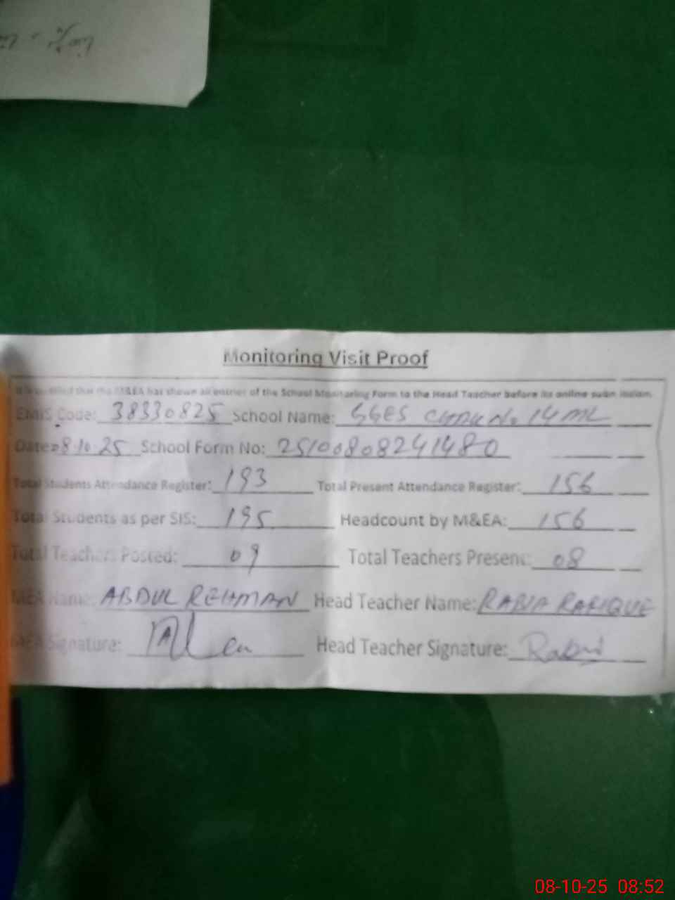 | Attendance Register | Head Teacher | MEA with School | Visit Proof |
