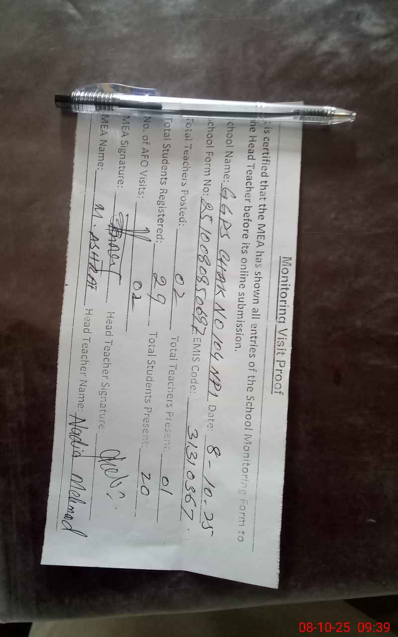 | Attendance Register | Head Teacher | MEA with School | Visit Proof |