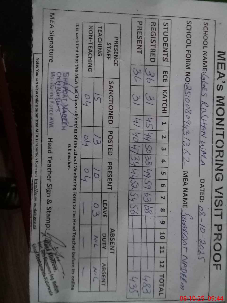 | Attendance Register | Head Teacher | MEA with School | Visit Proof |