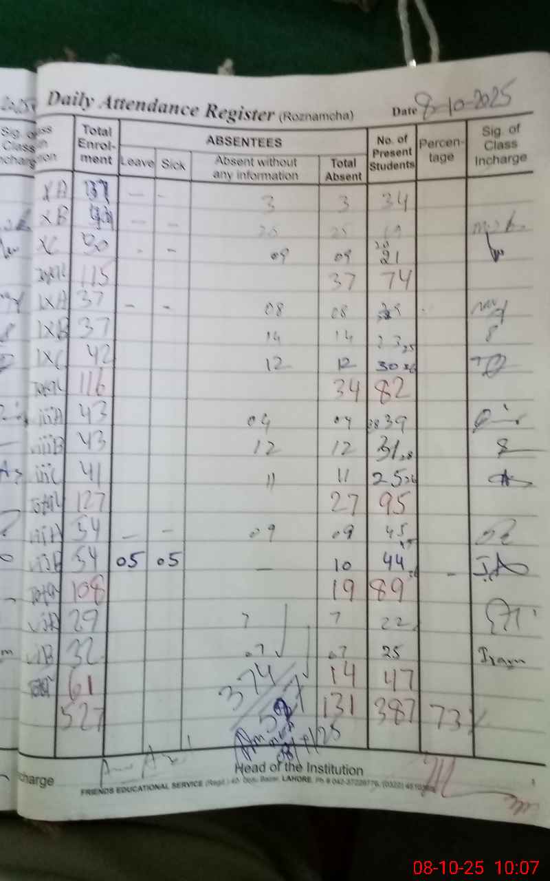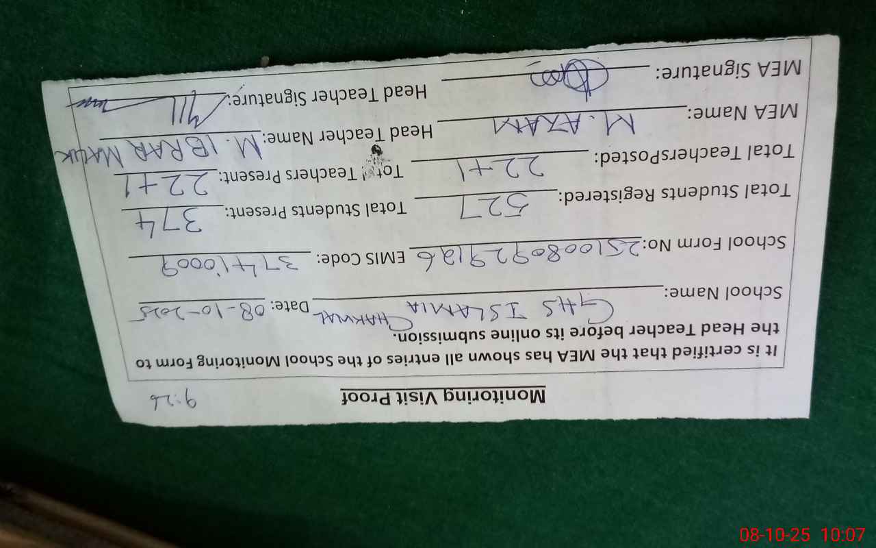 | Attendance Register | Head Teacher | MEA with School | Visit Proof |