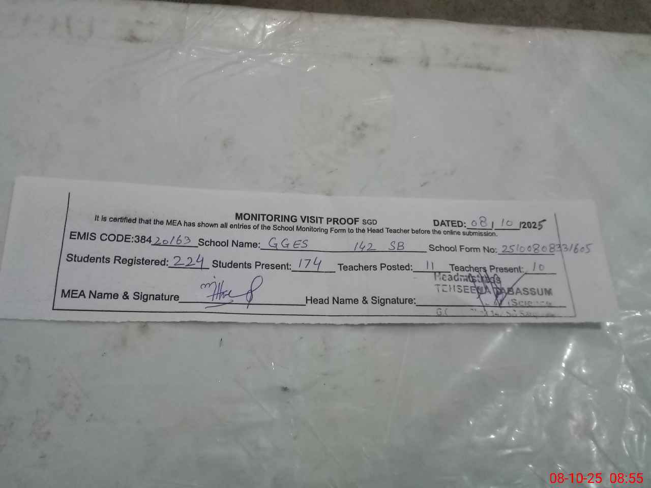 | Attendance Register | Head Teacher | MEA with School | Visit Proof |