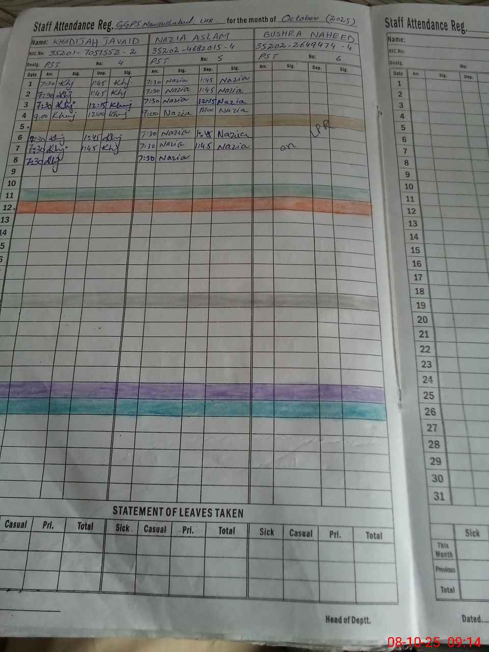 | Remarks (Use Separate Page if Required): PST teacher Bushra Naheed is on LPR wef 10th June 2025 to 04th February 2026 by notification no 3127 Lhr 2024 Retirement dated 10th December 2024 Due to shortage of classrooms nursery students are accommodated with ECE students in ECE class room at least three more class rooms are required about sixty plus students in each classroom There are not sufficient funds available in the school to pay further utility bills 35220365 | |||||