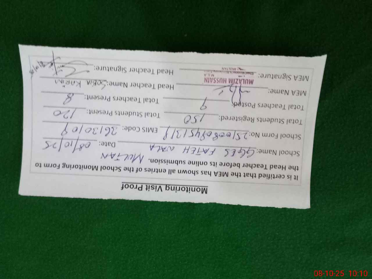 | Certified that this School was Inspected by the Undersigned MEA/DMO Today and the Information Stated Above is as Per Record. | |||||